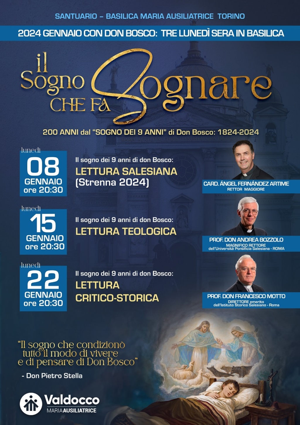 El bicentenario del Sueño de los Nueve Años de Don Bosco pretende ser para los salesianos de todo el mundo un año de retorno a las raíces de la esencia del carisma. Por esta razón, en la cuna salesiana de Valdocco, y más precisamente desde el centro espiritual mundial de la salesianidad, la Basílica de María Auxiliadora, en el mes salesiano de enero se llevarán a cabo dos iniciativas diferentes para profundizar en el tema del “sueño que hace soñar”: una exposición y tres noches temáticas, siendo la primera de ellas protagonizada por el Cardenal Ángel Fernández Artime, Rector Mayor de los Salesianos de Don Bosco.