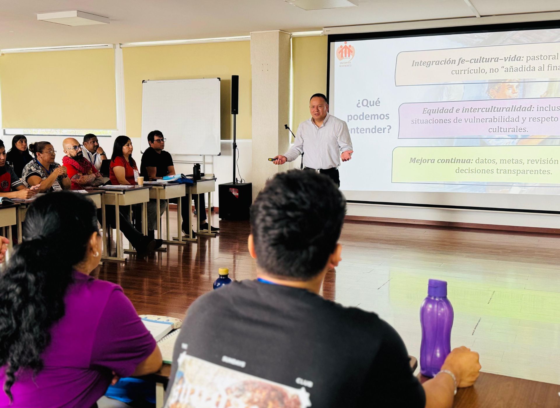 Las conferencias contaron con la participación del P. Mauricio Leime, delegado para la Pastoral Juvenil, quien abordó la temática «¿Qué Dios para los jóvenes de hoy?»; Daniel Llanos, docente de la UPS, presentó el tema «El mundo de los jóvenes»; el P. Juan Flores, vicario inspectorial, expuso sobre los «Retos de la educación de hoy»; y el P. Luis Timossi, del CSFPA, cerró con la ponencia «Como Don Bosco», animando a vivir el carisma con pasión y entrega.