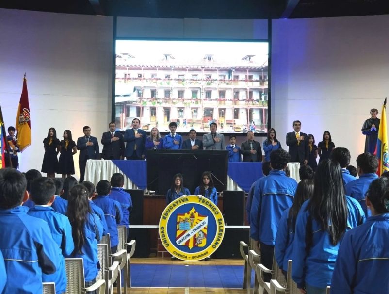 La Unidad Educativa Técnico Salesiano de Cuenca rindió homenaje al Día del Civismo Ecuatoriano con un programa especial desarrollado en el Coliseo Miguel Merchán, que contó con la participación de autoridades, docentes, estudiantes y padres de familia. La jornada inició con la entonación del Himno Nacional de la República del Ecuador, marcando el carácter solemne del acto y reafirmando el respeto por los símbolos patrios.
